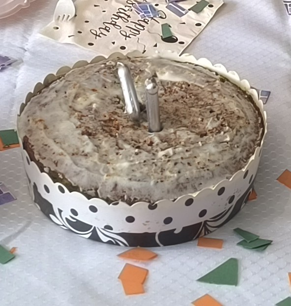 For her birthday, we celebrated with our family, with cake, fruit salad, and games, a low key and healthy birthday party, just as she wanted. Anneliese asked for carrot cake, and wanted the cake made without white sugar, so I found this honey sweetened carrot cake recipe and made adjustments to work with what I have in the house, in addition to making it gluten free so that I could also eat it.
