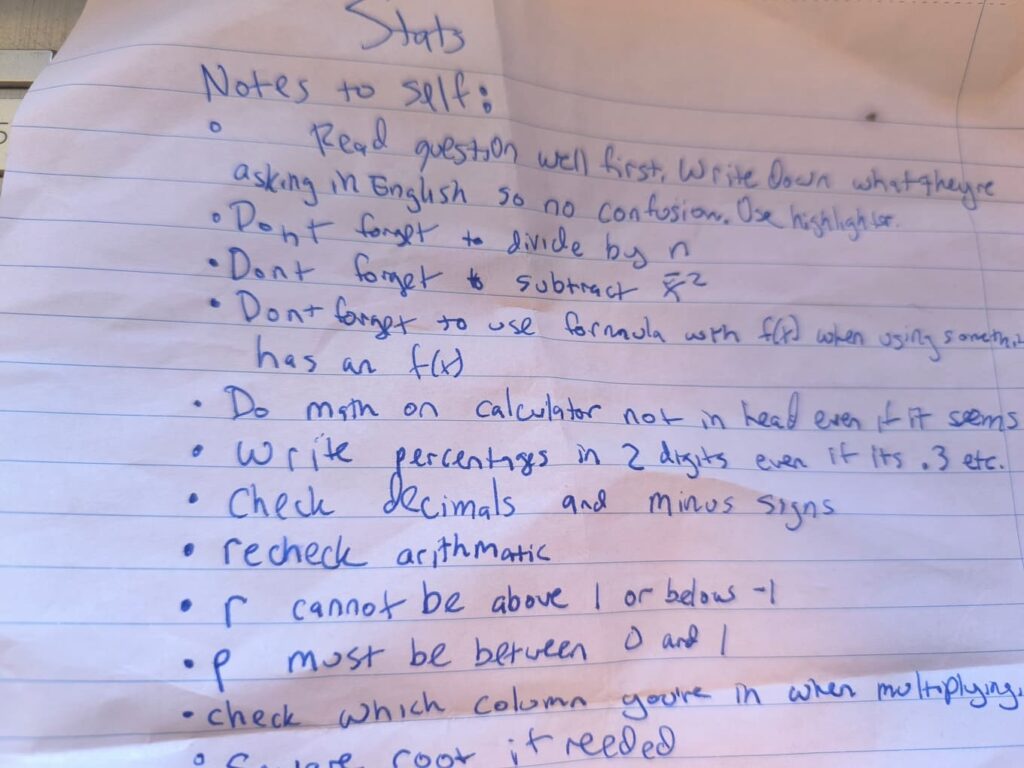 The day before my final I had one last tutoring session with my teacher, and we went over and made a list of things I needed to remember, hints to follow, or tips for myself based on mistakes I’d made in the past to get me through the test. I said that instead of practicing any more problems, I’d go over those and make sure I remembered them, because it was careless errors that could get me screwed over on the final. I took a picture of that and that is the image for this post.